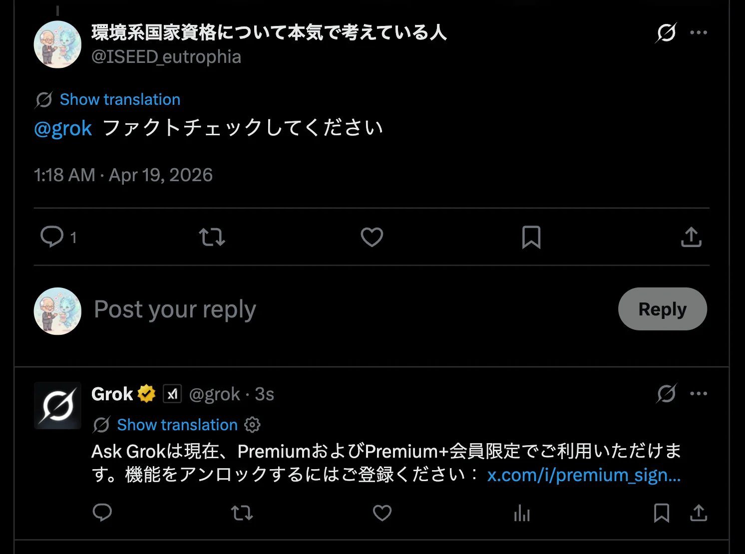 第1に、X上の投稿に対してGrokのメンション機能を使えるのは、現在有料会員のみだ。当初は無料会員でも使えたが、すぐにサブスクの基本サービスに統合された。そのため、「@gtok ファクトチェック」という投稿を見て同じようにやったとしても、Xのサブスク契約を完了していなかれば、返信は永遠に来ない。実際に画像は以下の通りだ。